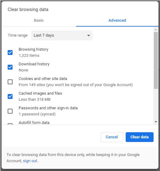 - 'Çerezler ve diğer site verileri' onay kutusunu seçin.